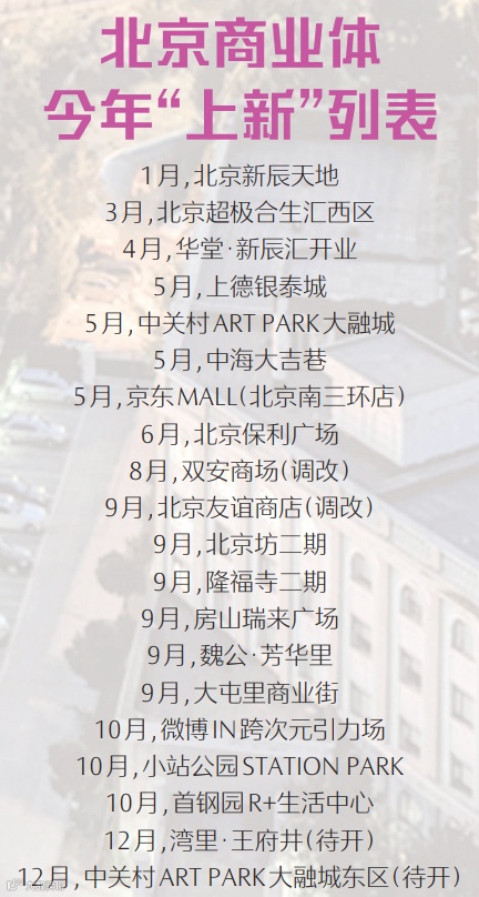 政策的红利仍在持续释放。目前,商业企业升级改造项目的申报仍未结束。通州湾里、中关村ART PARK大融城东区等一批特色项目也即将亮相,预示着北京商业的提质升级仍在持续向前。