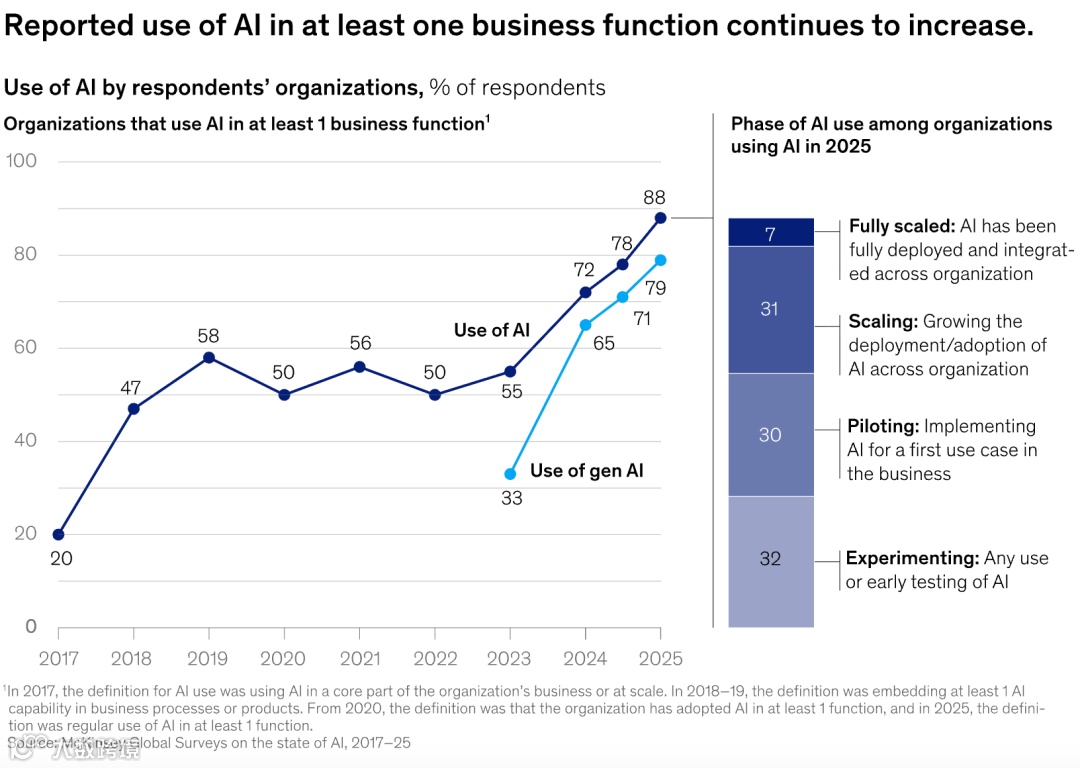 商业热情也在降温。尽管ChatGPT拥有8亿月活用户,但美联储与普查局数据显示,工作中每日使用生成式AI的人群比例仅为12%,一年来几乎停滞。麦肯锡报告揭示,三分之二企业仍处于“试点”阶段,能从中获得超5%收益者寥寥。
