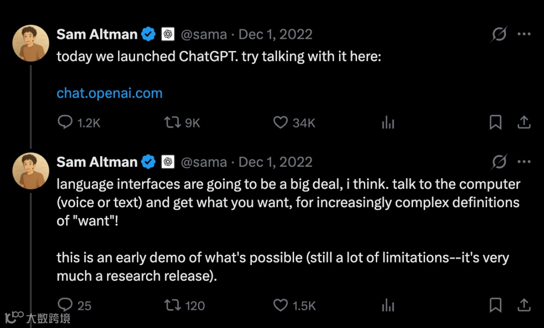 2022年12月1日,Sam Altman在推特上低调宣布ChatGPT上线,称其为“一个早期的演示”,并强调其局限性与研究预览性质。