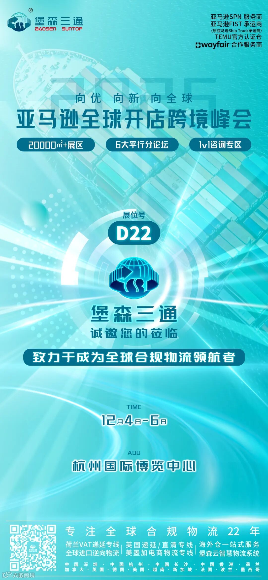 本次峰会,堡森三通将在D馆S-D22展位与大家见面,诚邀广大同仁、客户的到来,共话跨境物流新趋势,携手开启全球贸易新航程!