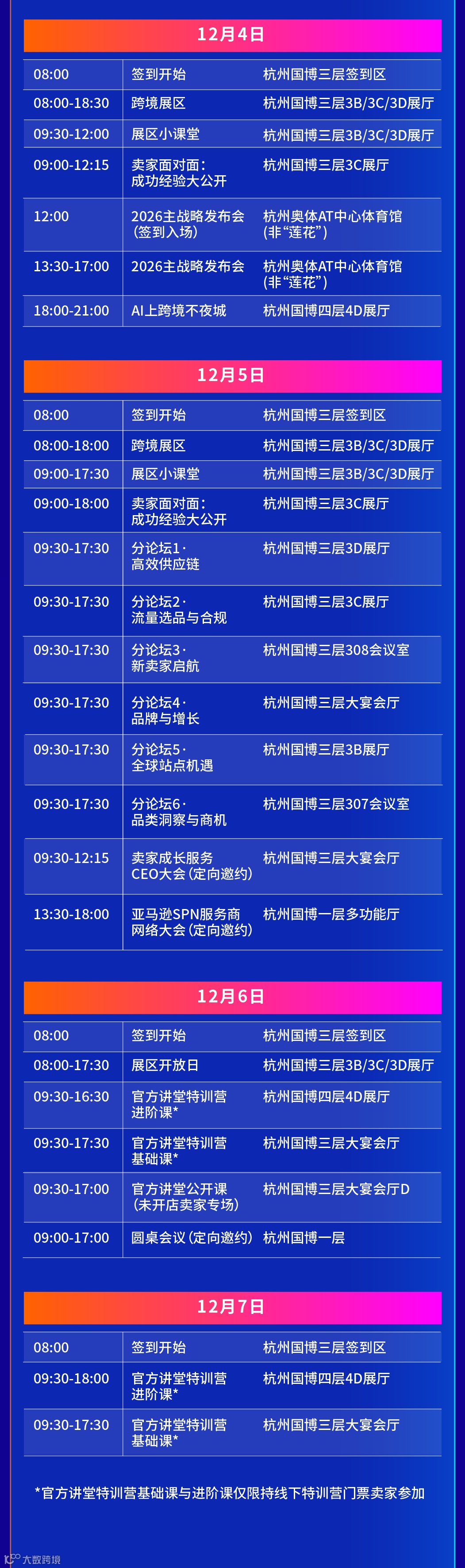 12月4–7日,2025亚马逊全球开店跨境峰会将在杭州杭州国际博览中心隆重举行,今年峰会以 “向优、向新、向全球” 为主题,围绕2026主战略发布会、六大平行分论坛、官方讲堂特训营等核心板块,聚焦供应链管理、AI应用、选品拓展、品牌与流量、合规等跨境卖家最关心的前沿议题提供针对性解决方案。