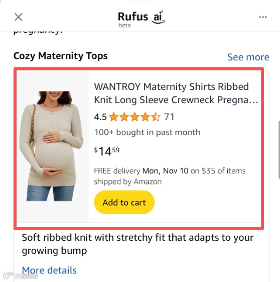 亚马逊AI助手Rufus已验证这一机制:上传一张孕妇照片并提问“适合穿什么衣服”,即便未提及怀孕,Rufus也能识别出孕期状态,并推荐孕期服饰。