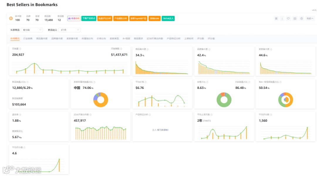 市场数据显示,在100个样本中,新品占比12个,新品销量贡献率为6.29%。商品集中度34.3%,品牌集中度42.4%,卖家集中度44.6%,中国卖家占比高达74.06%,类目退货率为1.88%,整体竞争格局较为集中,中国供应链优势明显。