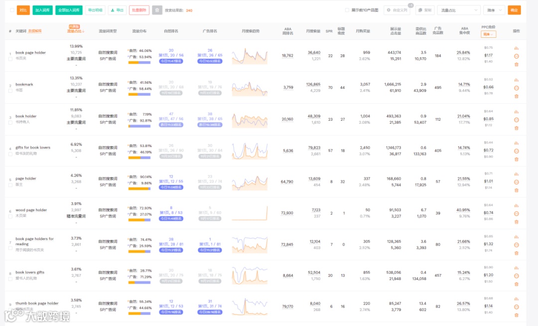 反查结果显示,产品流量主要依赖广告获取。核心关键词中,“book page holder”PPC竞价为1.17美元,“bookmark”为0.66美元,“book holder”为0.85美元,推广成本处于中等水平。