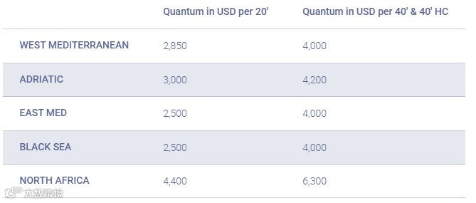 - 远东至西地中海:2975美元/TEU、3950美元/FEU