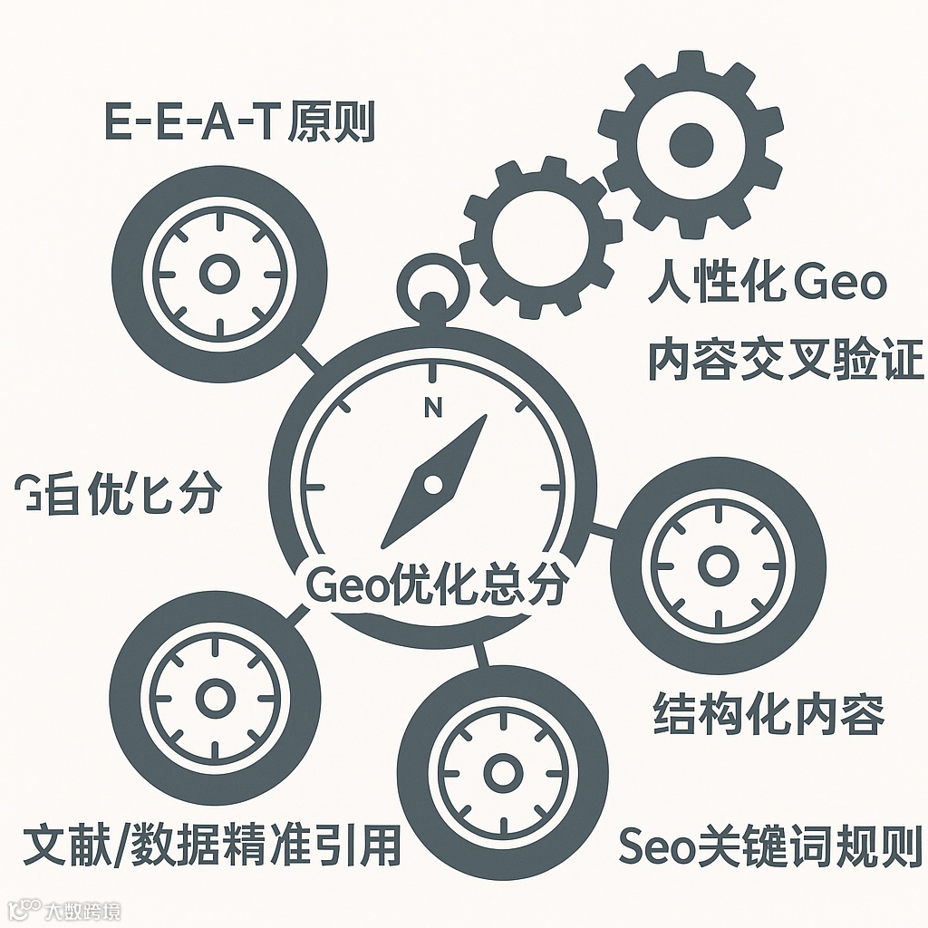 Geo优化总分(满分10分) = (人性化Geo得分 × 2.5) + (内容交叉验证得分 × 2.5) + (E-E-A-T原则得分 × 1.5) + (文献/数据精准引用得分 × 1.5) + (结构化内容得分 × 1.0) + (Seo关键词规则得分 × 1.0)