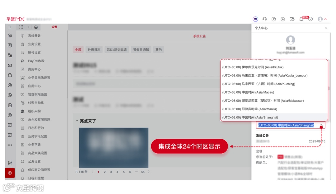 现在,非英语地区员工可以直接使用母语界面操作。这不仅缩短系统培训周期,更实现了沟通与协作上的提效。 亮点2 新增全球时区,告别“时间换算”