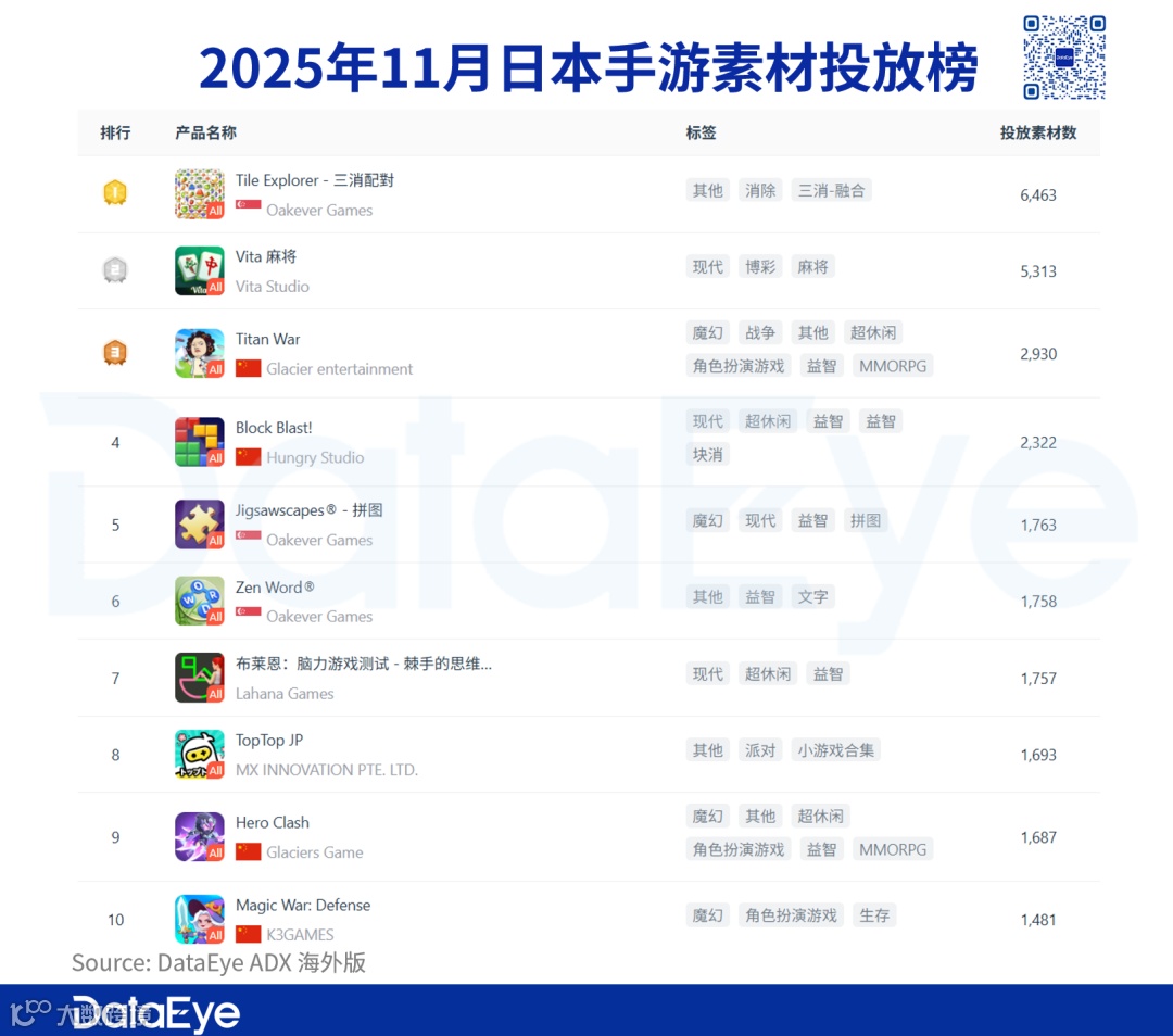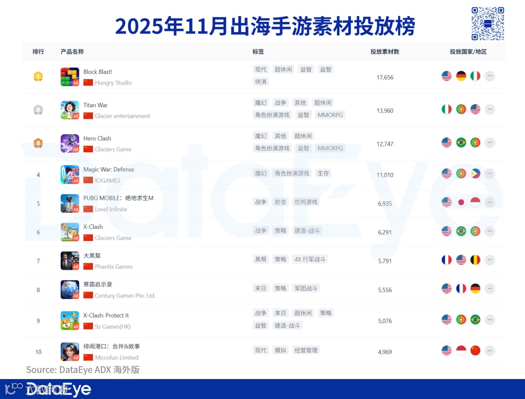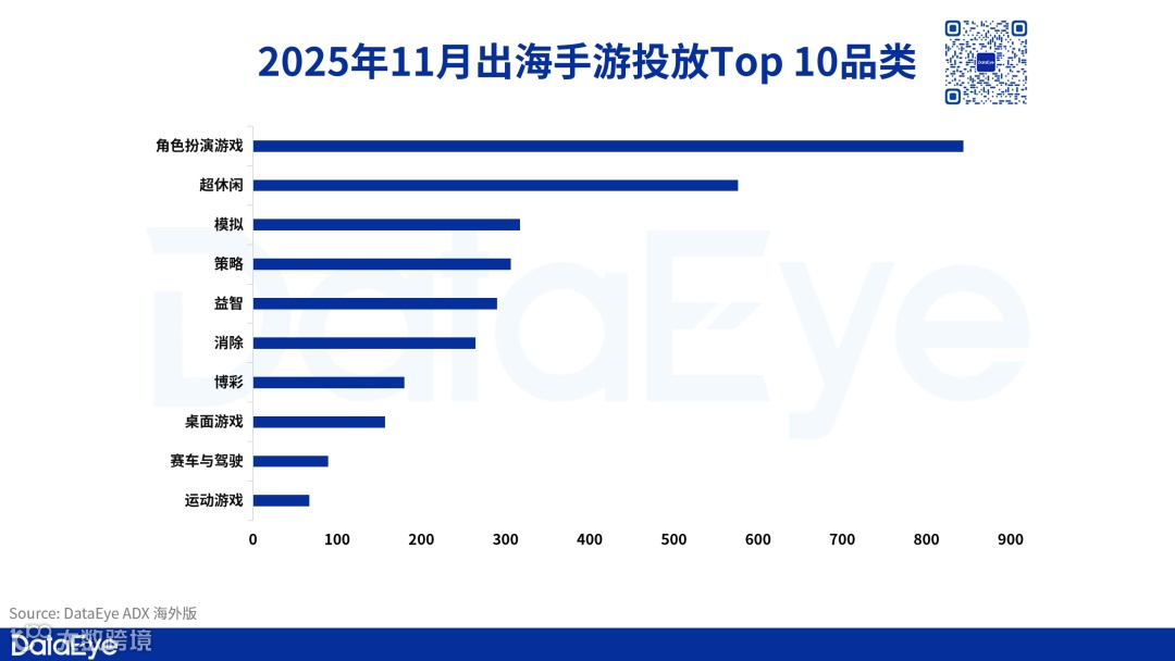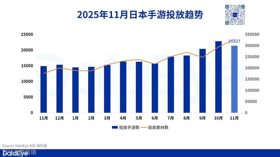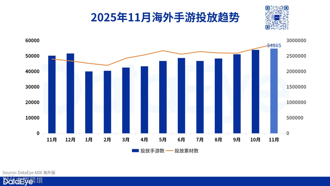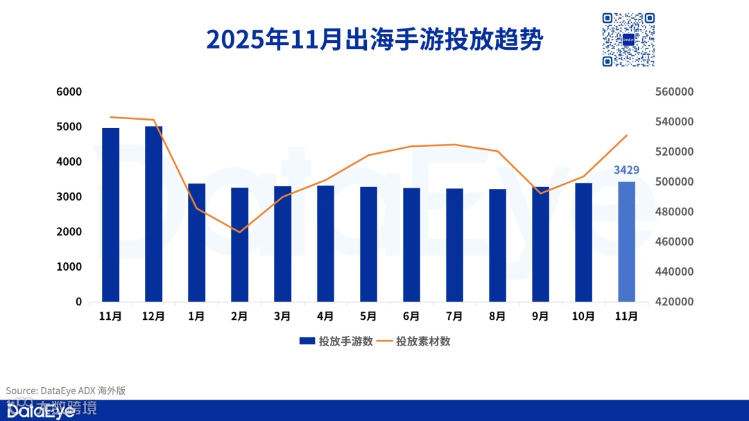 DataEye-ADX海外版数据显示:2025年11月中国大陆出海投放的手游数达到3429款,为今年以来的单月新高;出海投放的广告素材数同样有着5.4%的环比涨幅,总计超过53万组。