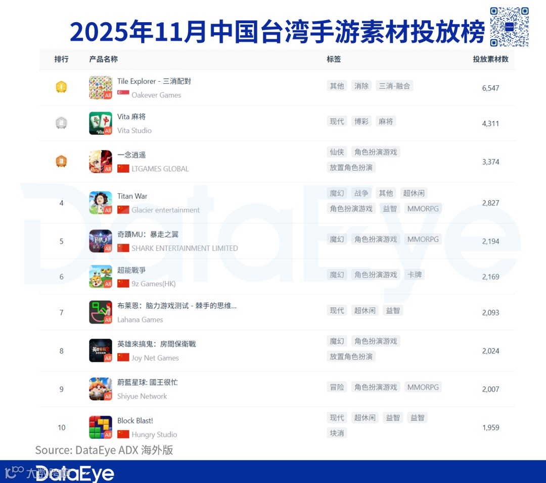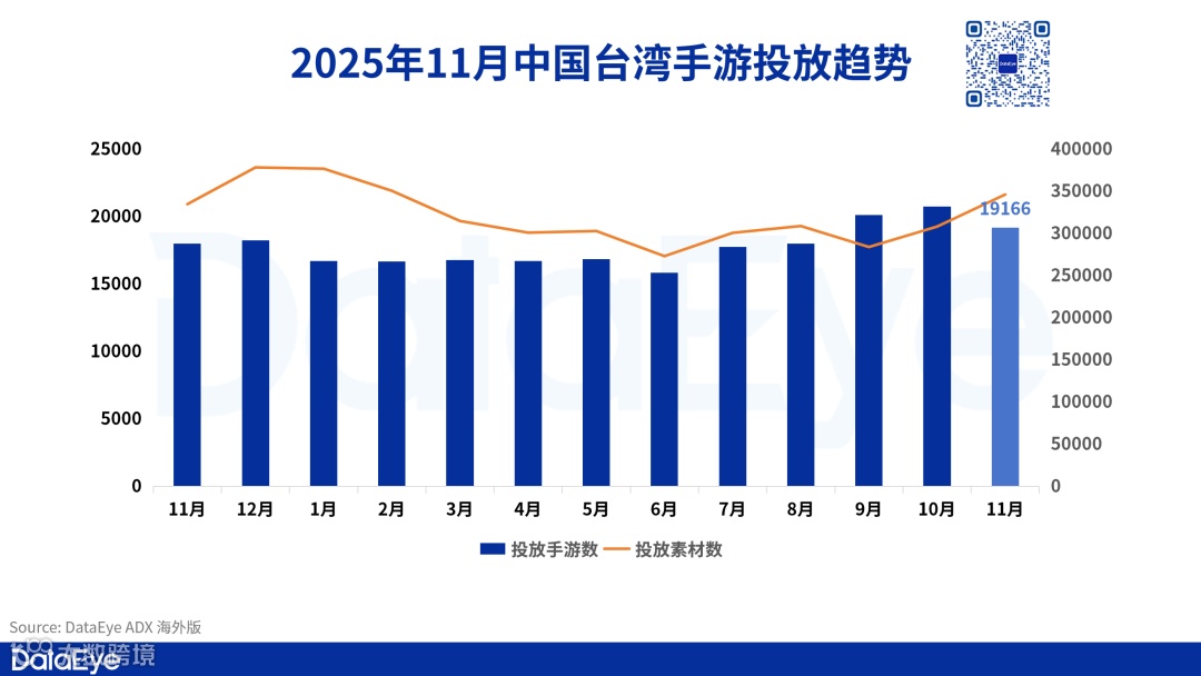 DataEye-ADX海外版数据显示,11月份的中国台湾在广告素材投放数上创下了今年的单月新高:达到34万组。而11月的投放手游数量则达到1.9万款。