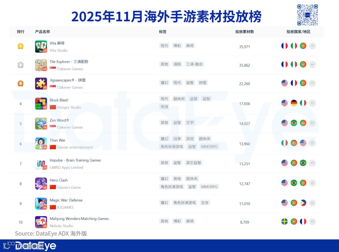 Hungry Studio的《Block Blast!》稳居第四,而冰川网络则有三款游戏上榜,并以美国市场为主要投放目的地。本月挤进Top 10的《Mahjong Wonders™》则是又一款麻将接龙游戏,游戏从7月份开启投放,在11月单月投放了8700组素材。