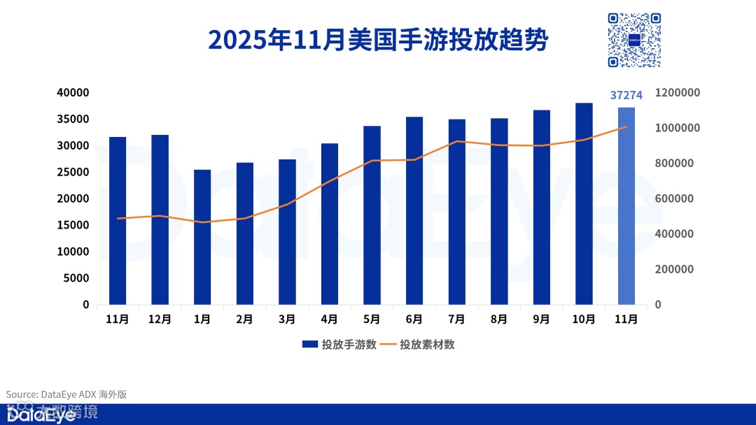 DataEye-ADX海外版数据显示:11月份美国市场投放手游数为3.7万款,相比上一月份有小幅下滑;投放广告素材量则在今年首次超过100万组,在美国市场,买量市场的竞争依旧激烈。
