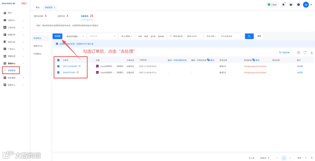 勾选待索赔订单后,点击“去处理”,订单将统一进入“索赔中”页面。