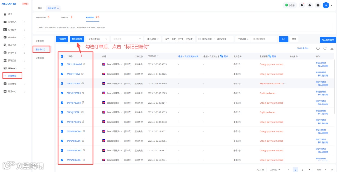 平台完成赔付后,卖家可回到“索赔中”页面,勾选对应订单,点击“标记已赔付”按钮,订单状态即变为“已索赔”,买家可以清晰掌握每笔款项进度,实现索赔工作的闭环管理。