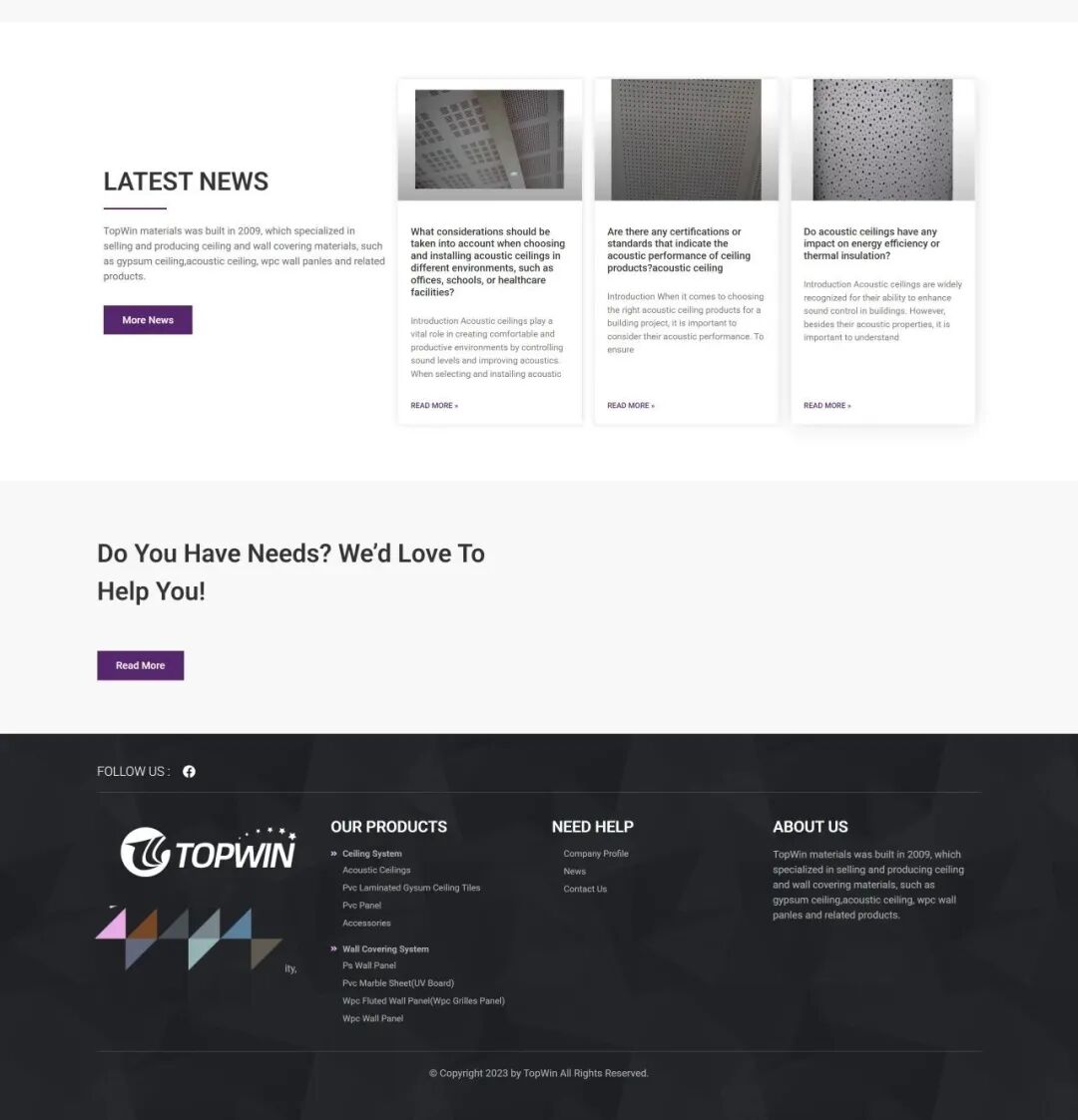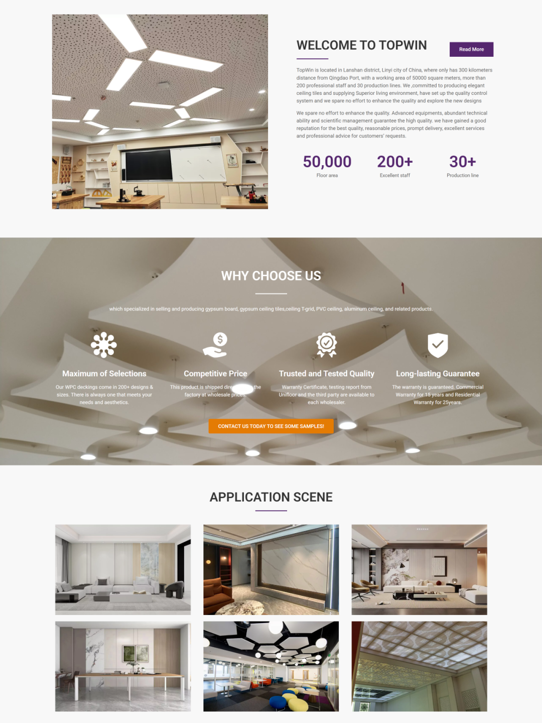 这是我们为一家专注于 吊顶系统与墙面装饰板材 的专业制造及整体解决方案供应商打造的官方网站。网站系统展现了企业在 吸音天花、PVC墙板、覆膜石膏吊顶板、UV大理石板、WPC/PS木塑装饰板 等产品领域的创新实力与全球供应能力,致力于为建筑空间、商业工程与家居装饰项目提供 高品质、美观耐用、环保节能 的综合装饰方案。