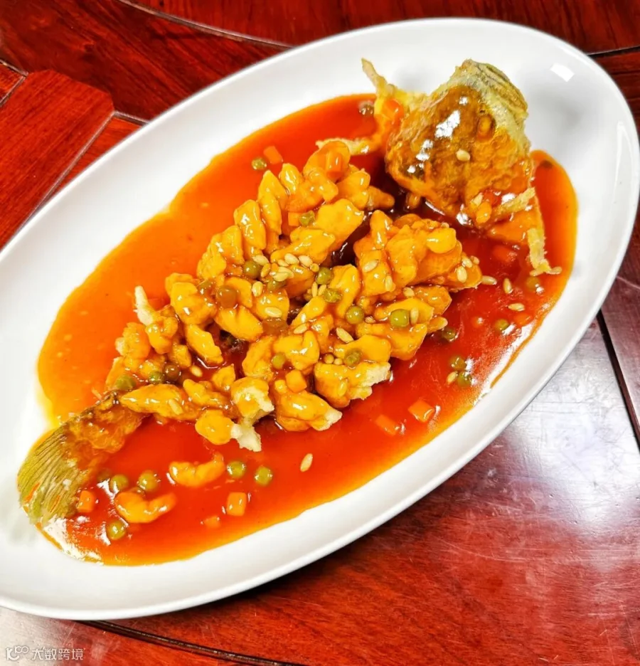 大黄鱼炸至金黄,表皮酥脆,里面的鱼肉依旧雪白细嫩,再裹上酸甜茄汁,口感层次鲜明。松仁点缀其间,增添油润果香与脆粒感,整体酸甜咸鲜平衡,令人回味。