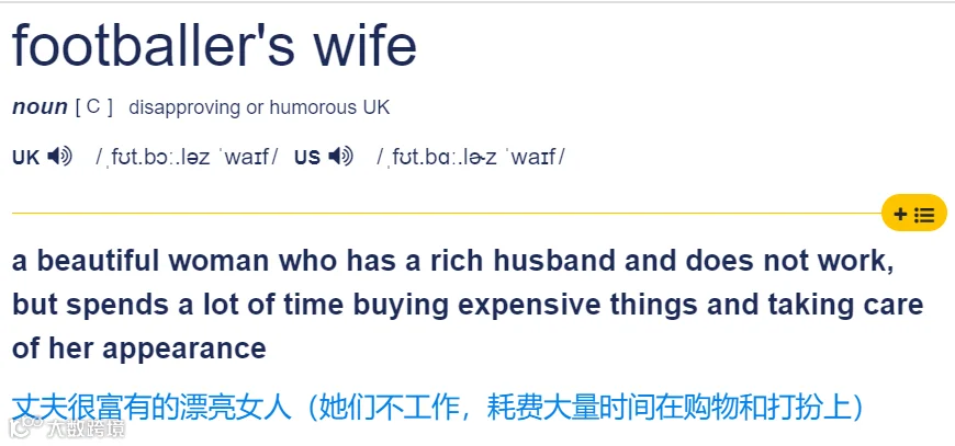 “footballer's wife”逐渐引申为“只消费不工作、生活奢华的阔太太”[k]。