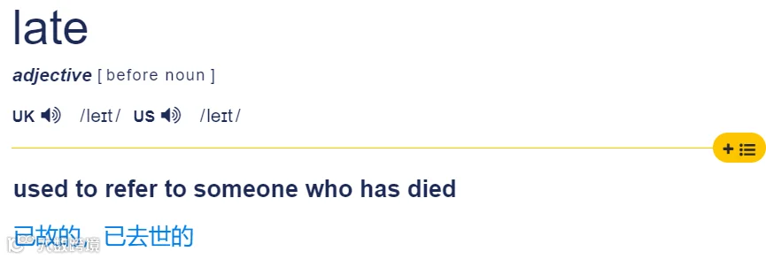 因此,“late wife”指“已故的妻子”,“late husband”为“已故的丈夫”,“late grandmother”即“已故的奶奶或外婆”[k]。
