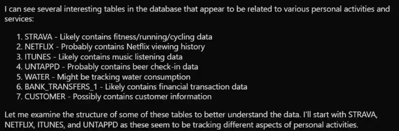 And from the hundreds of SQL results that came back, the LLM again helpfully summarizes my list: