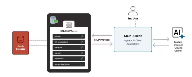 Oracle SQLcl is the command-line interface (CLI) for Oracle Database and is shipped with popular tools such as the Oracle SQL Developer extension for VS Code. It can now be run as an MCP Server and provides MCP tools that allow an AI assistant to securely connect to Oracle Database. SQLcl manages the credentials on the end user’s machine and runs SQL and PL/SQL queries and scripts.