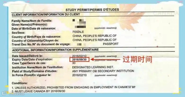 此外,Study Permit的过期时间通常显示在护照或签证的靠下位置,请务必留意。