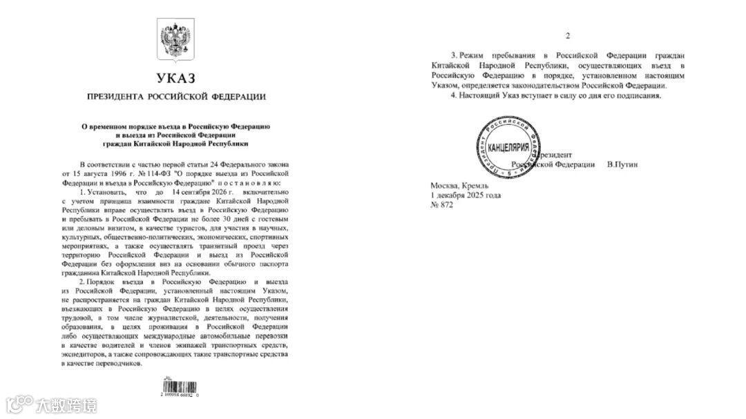 在12月1号,中俄关系迎来历史性突破,俄罗斯总统普京签署了最新命令,中国公民即日起至2026年9月14日(含14日)前可免签证以旅游和商务目的前往俄罗斯,免签天数为30天。