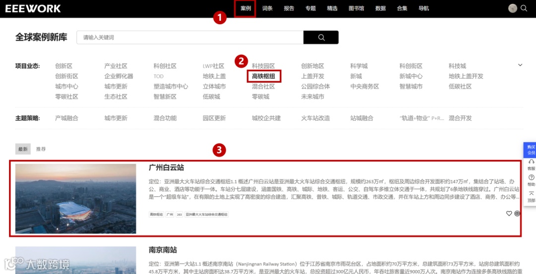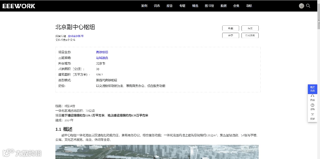 EEEWORK案例库4.0板块中重点研究了20个最新高铁枢纽案例,每个案例整理了规模、定位、简介、借鉴点、参考文献、平面图、效果图等。