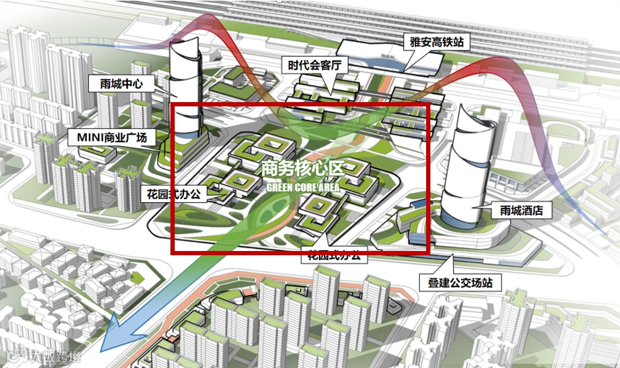 雅安站弱化站前广场,打造站前花园式总部商务区,增加站前烟火气。敞开核心区,中部形成人流聚集的廊道,塑造站前景观通廊,打造城市通江轴线;站前区低密建设,形成环境优质的花园式办公区,配套办公型餐饮、零售等业态,白天聚集办公人群,晚上利用廊道和广场聚集活动人群,增加站前烟火气。