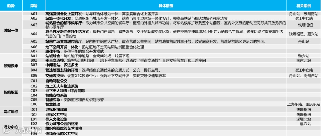 通过案例分析,我们总结了五个维度的规划策略:站城一体、交通换乘、智能枢纽、网红地标和活力中心,并进一步细化为20+个具体策略。接下来,我们将详细介绍这些策略及其相应的措施。