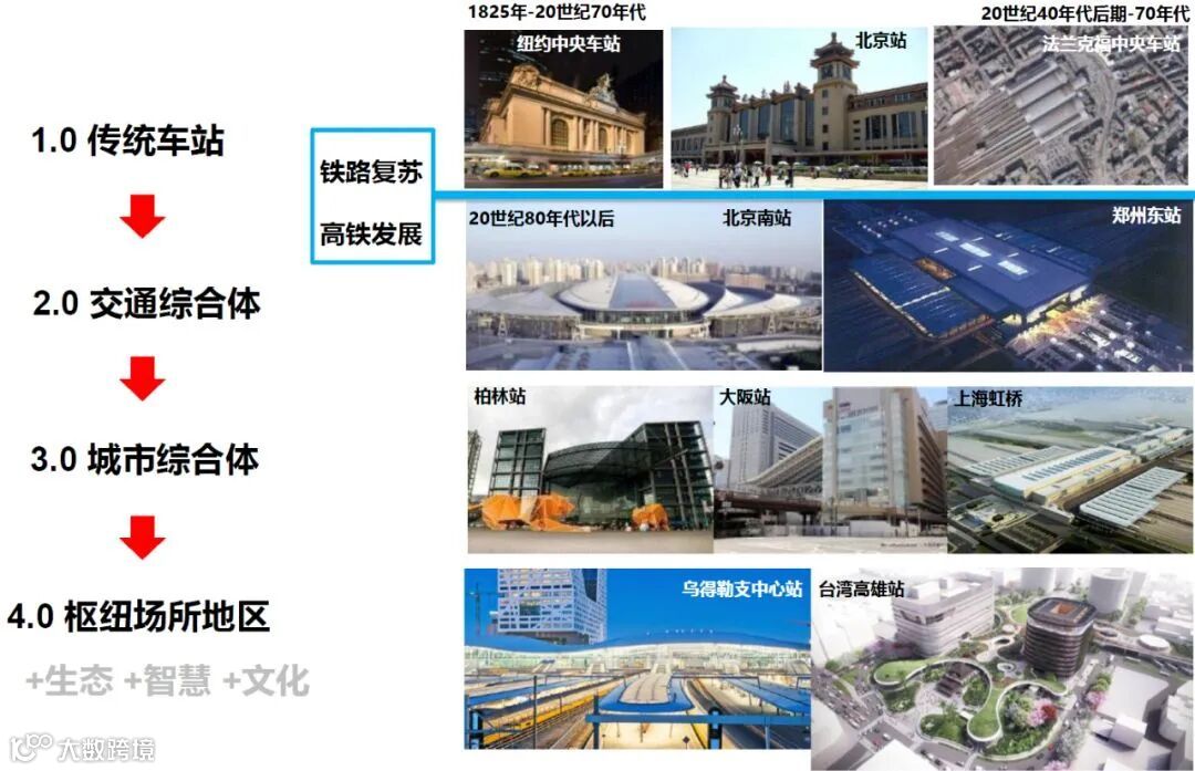 2.0时代 交通综合体,换乘集成化。全天候换乘空间取代广场成为主要换乘场所,以铁路为核心整合交通功能,与城市空间衔接少。如北京南站、郑州东站。