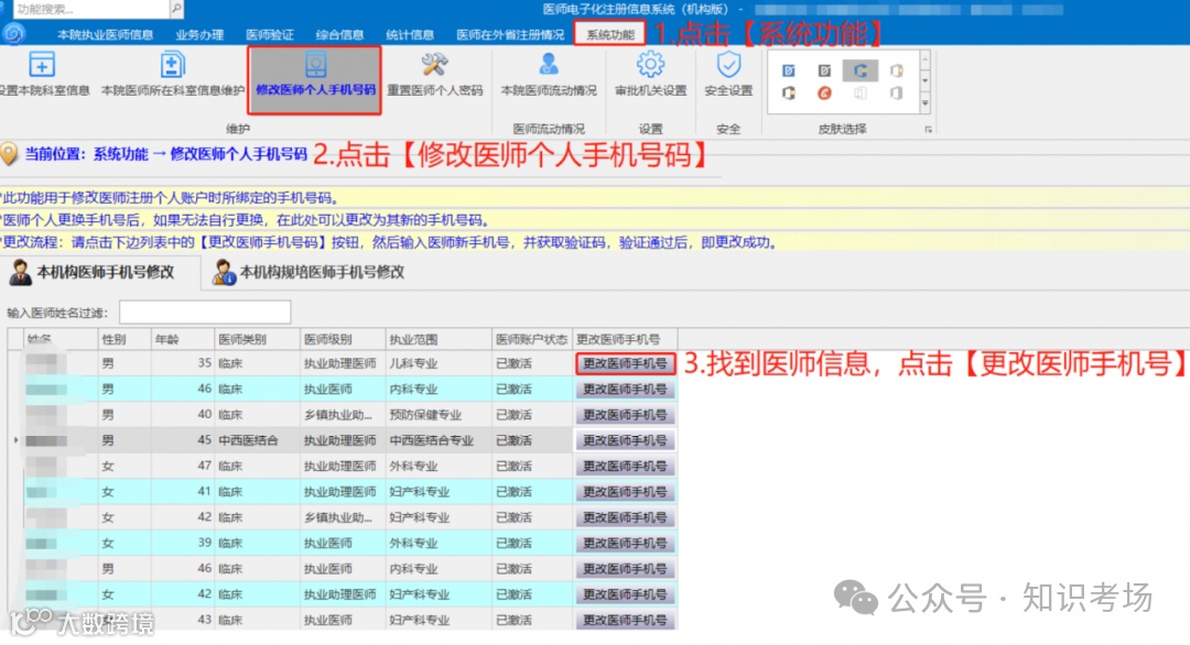 在已经更换绑定手机号、原手机号遗失或者注销,不能正常接收短信的情况下:请联系医师当前注册工作单位登录《医师电子化注册信息系统(机构版)》:在【系统功能】--【修改医师个人手机号】中更换新的手机号,然后再用新手机号找回账号密码。