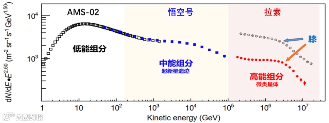 宇宙线能量分布图上有一个关键转折点,由于其形状酷似人的膝盖,被称为“膝”,大约在3PeV处,能量更高的宇宙线数量急剧减少。长期以来,测量“膝区”的宇宙线质子能谱被认为是“不可能完成”的任务。拉索巧妙利用其强大的地面观测装置,采用多参数测量技术成功筛选出大统计量的高纯度质子样本,从而精确测量其能谱,精度媲美卫星实验。这一突破性的测量揭示了完全超出预期的能谱结构,清晰展现出一个新的“高能组分”。