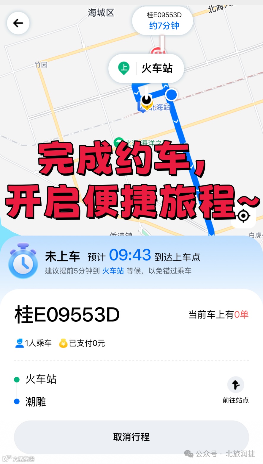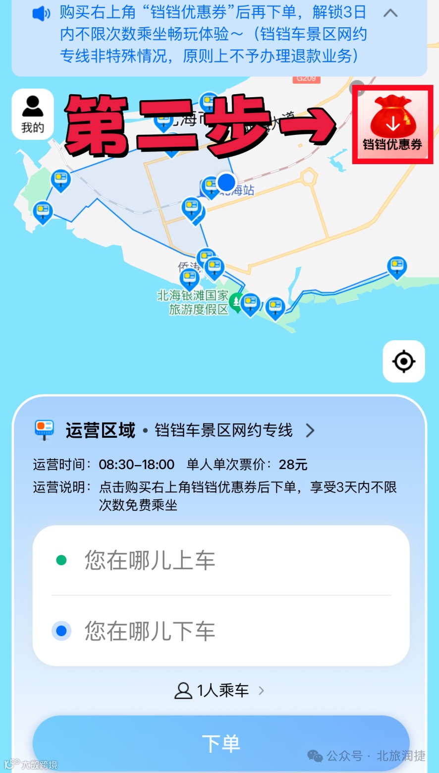 旅客可以通过关注北海润捷公司服务号,选择铛铛车景区网约专线业务,在上下车站点界面选取上下客站点,填写出行人数后,点击下单,即可完成约车(详细操作流程附后)。