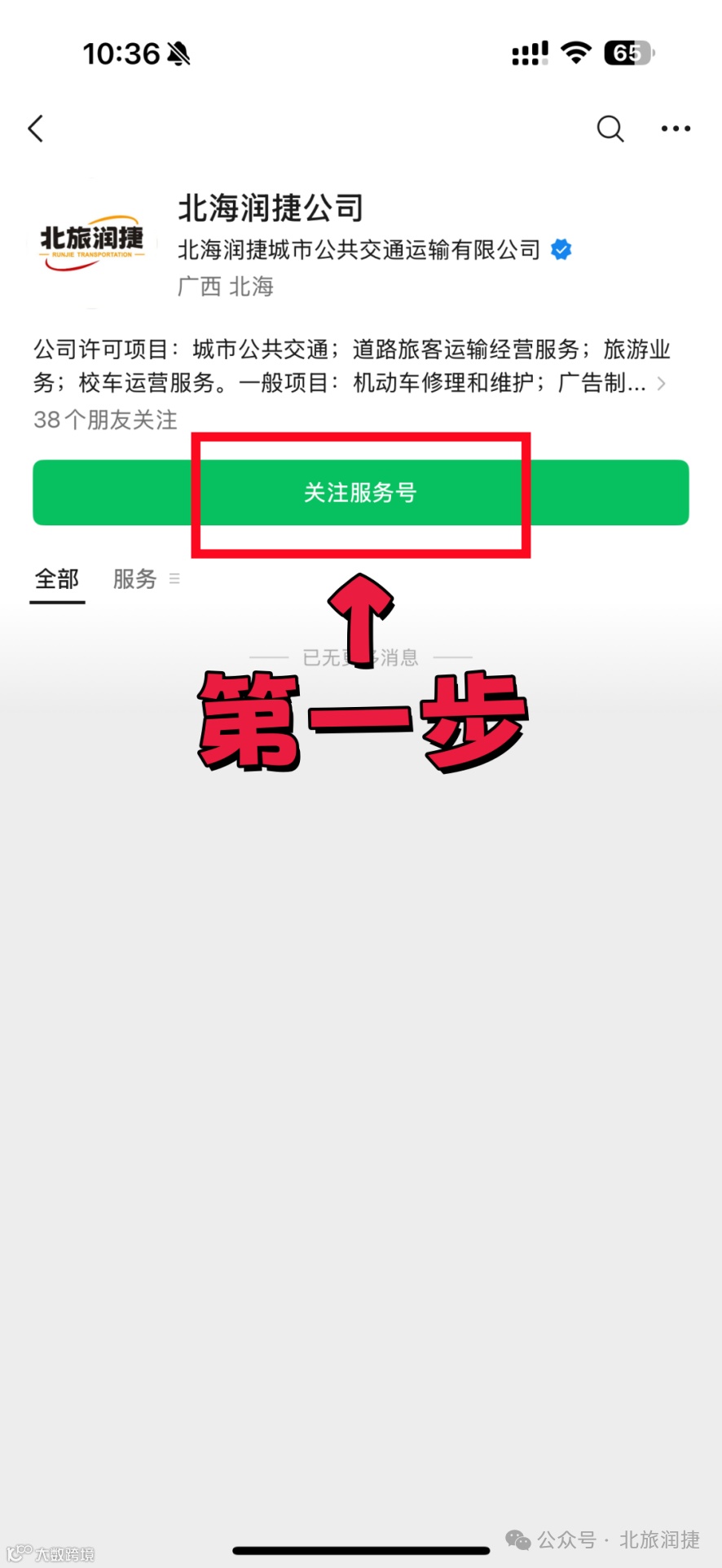 1. 关注“北海润捷公司服务号”➨选择“网约业务”➨点击“铛铛景区专线”