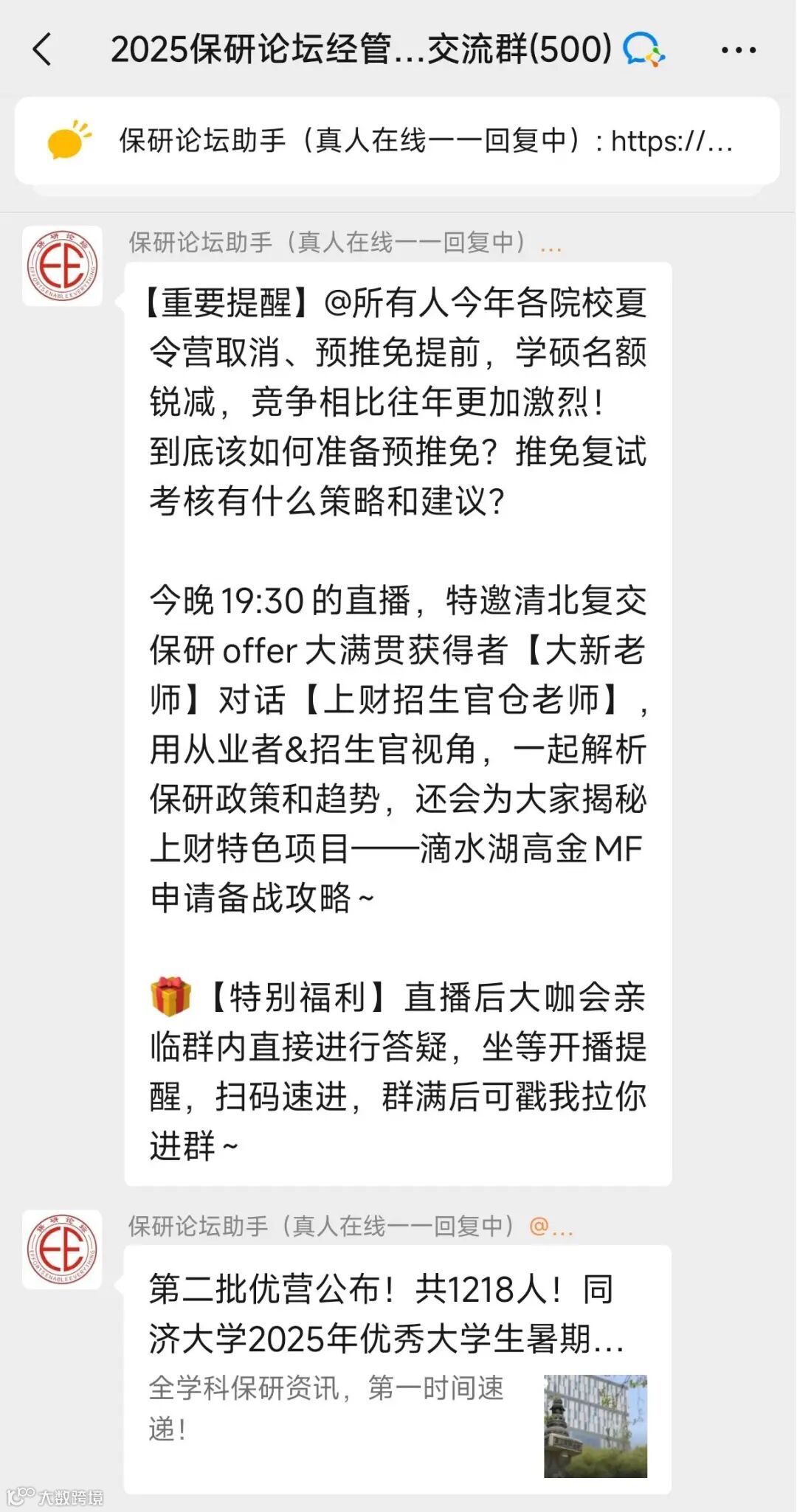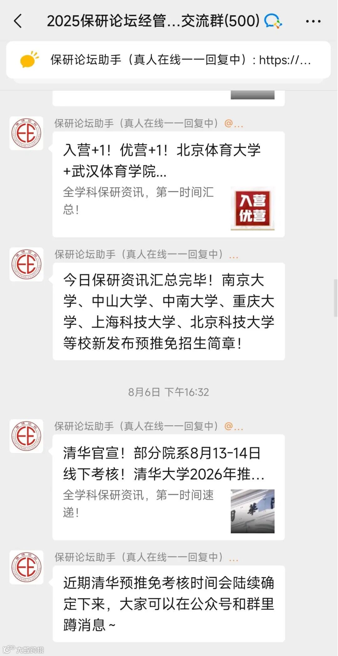 群内将及时转发夏令营、预推免及九月推免相关政策变动,结合趋势分析、公益讲座、直播答疑和学长学姐经验分享,集中整合碎片化信息,帮助学生省心省力地掌握全局动态。