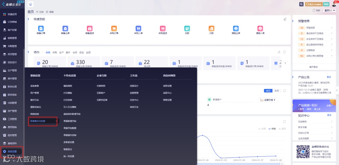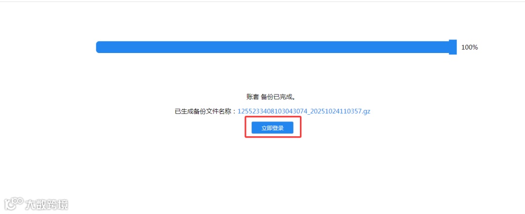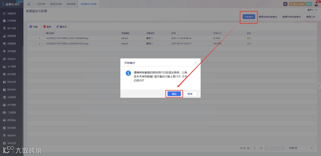 1、依次点击[系统设置]-[账套备份与恢复]点击右上角“开始备份”,系统提示“请确保账套里的其他用户已经退出系统,以免丢失未保存数据”若确定其他账号已经退出系统则继续点击“确定”开始备份,等待备份完成直接点“立即登录”即可。