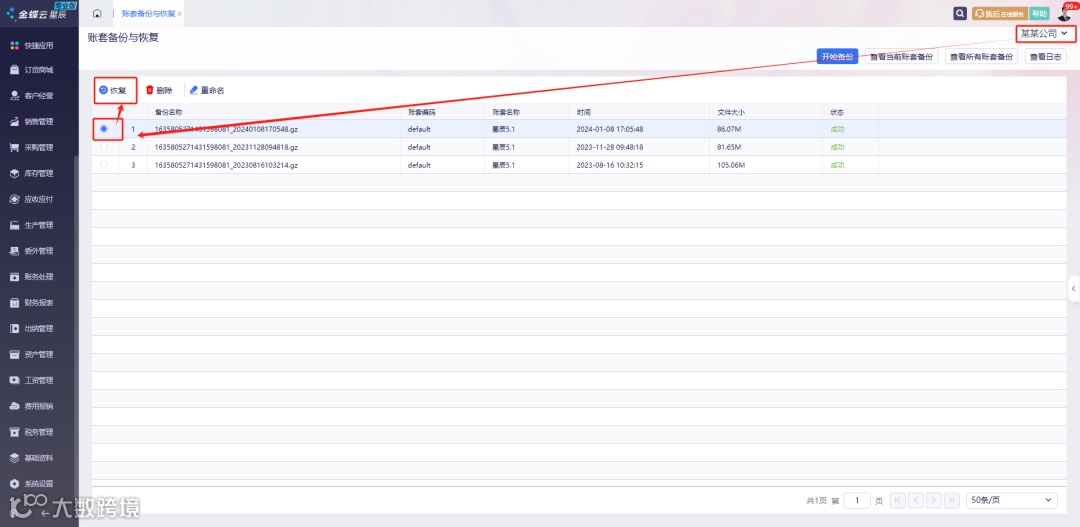 b、右上角选择账套,切换至子账套B,在“查看所有账套备份”中选择刚才备份的账套并点击恢复即可