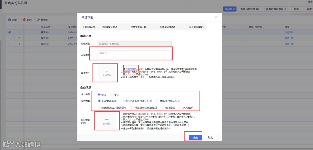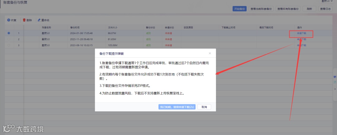 ③账套备份申请下载通常1个工作日后完成审批,审批通过后7个自然日内需完成下载,过有效期需重新提交申请。