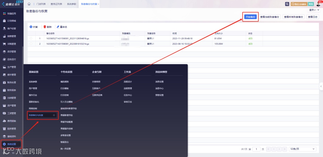 a、登录后进入需要备份的子账套A,在系统设置—账套备份与恢复界面进行开始备份操作,并等待备份完成;参考步骤1操作