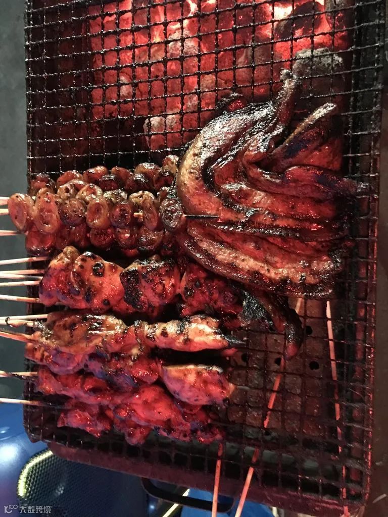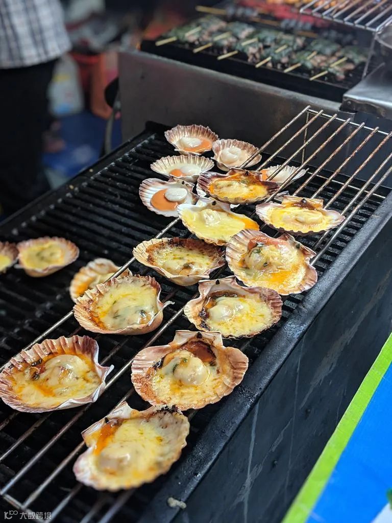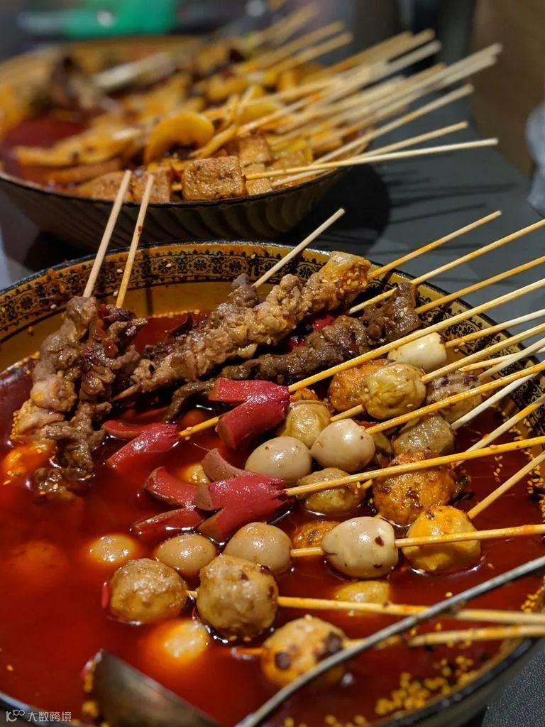 夜市汇聚多样地道小吃,包括腌鸡肉串、奶酪扇贝、钵钵鸡等特色美食