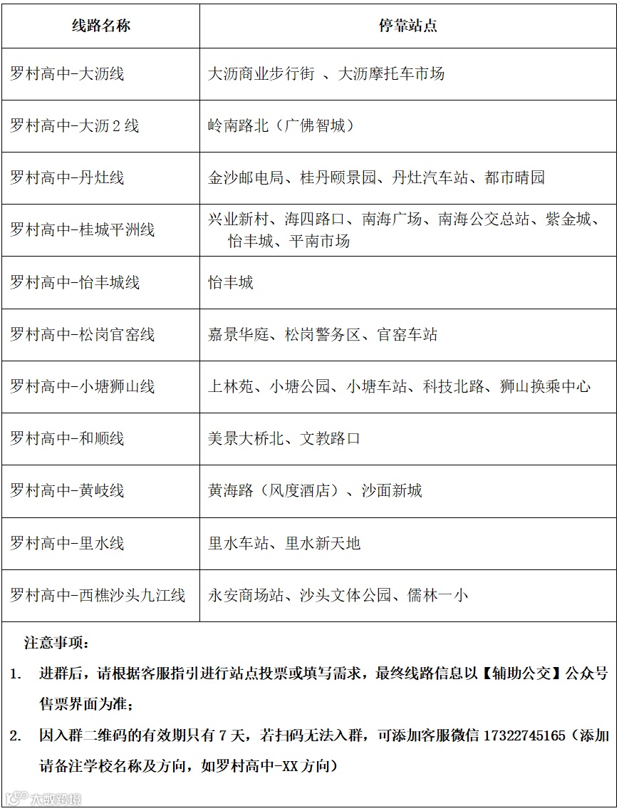目前罗村高中正在运营线路共11条,覆盖桂城、平洲、丹灶、大沥、松岗、官窑、狮山、和顺、里水、黄岐、西樵、九江等多个方向,为更好地提供贴近本校学生出行需求的服务,现拟对2025级新生开展需求征集工作,欢迎有需要的家长根据线路方向扫码进群咨询了解。