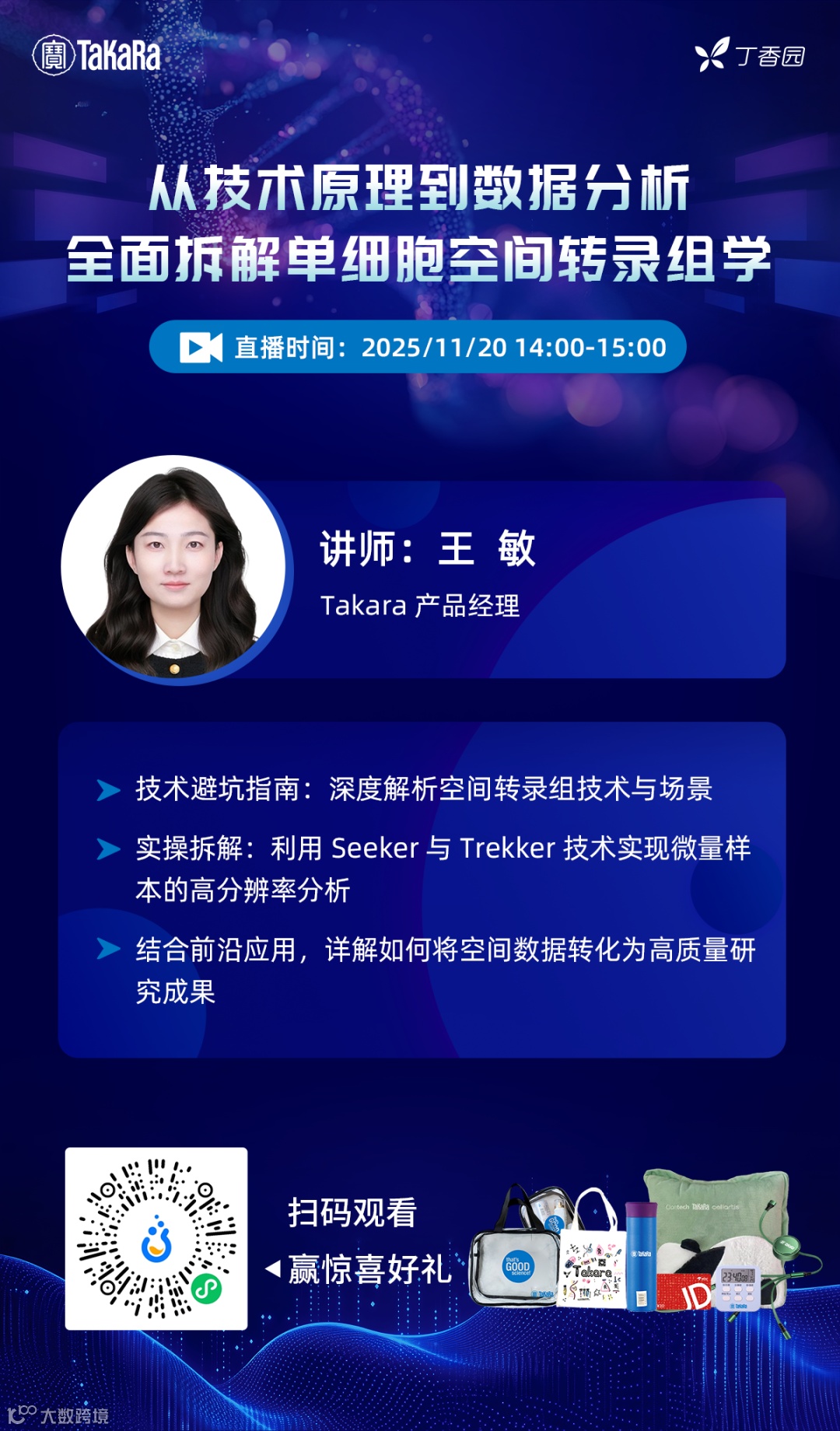 那么,在现实的科研场景中,我们该如何突破技术壁垒,高效开启高质量的空间生物学研究?宝日医将于 2025 年 11 月 20 日(周四)14:00,推出专题讲座《从技术原理到数据分析,全面拆解单细胞空间转录组学》。本次直播将直面当前空间转录组研究中的典型痛点,分享无需专用设备即可实现高分辨率的灵活解决方案 —— 基于 Slide-seq 与 Slide-tags 两大前沿技术衍生的 Seeker 与 Trekker 深度解析。现在报名直播,还有机会赢取乐扣保温杯、熊猫抱枕被、计时器、洗漱化妆包、数据线、帆布包等多重精美礼品!