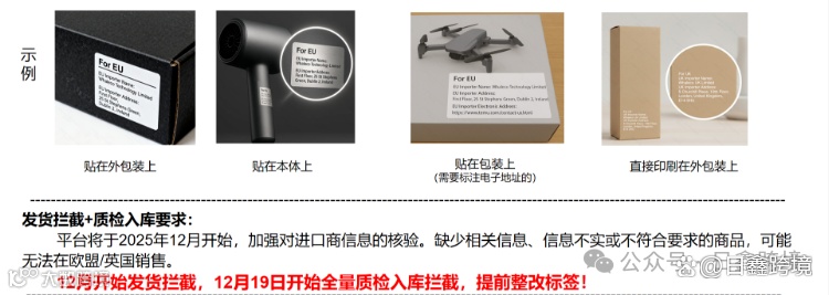 Temu欧洲站12月19日起强制标注进口商信息,覆盖欧盟及英国全类目,按指定模板贴于商品本体或外包装,需同步更新实拍图。合规需完整展示信息,违者拦截下架,还需配合欧代等已有要求。