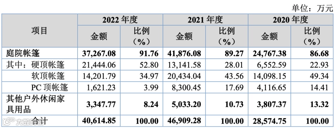 其实从产品构成来看,泰鹏的产品与其公司名中的“智能”二字实在不太沾边。从收入分布来看,其收入绝大部分都自庭院帐篷。2020年-2022年三年中,泰鹏智能的庭院帐篷收入占比,均超过90%