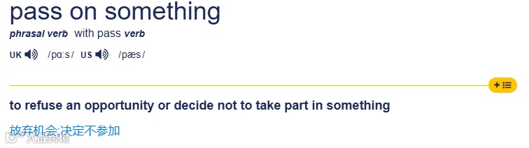 当“pass on”与机会、提议等搭配时,意为“放弃”或“拒绝”[k]。