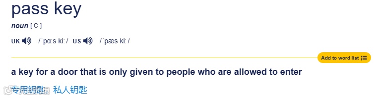 此处“pass”为名词,表示通行权限。pass key 指仅限授权人员使用的私人或专用钥匙[k]。