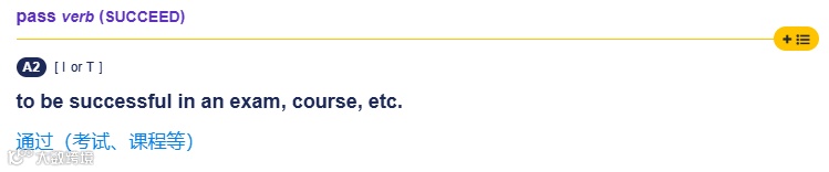 根据词典释义,pass 在考试、课程或面试等场景中表示“及格;合格;通过”[k]。