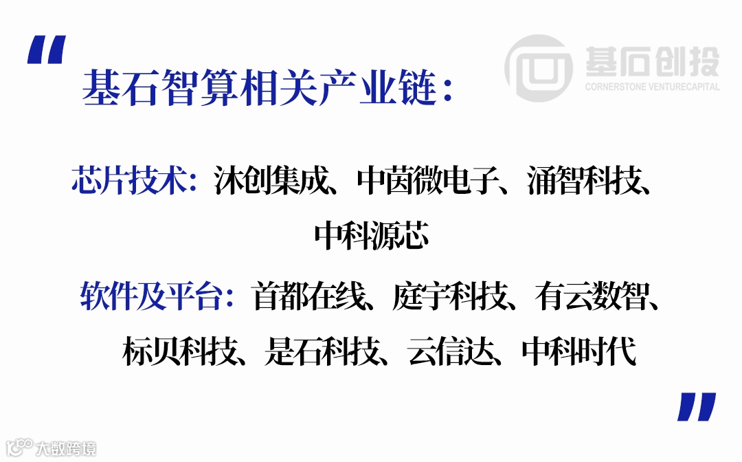 近年来,基石创投已在智算基础设施领域形成系统性布局,从芯片技术到软件及平台布局了大量企业,例如涌智科技(智算基础设施技术的芯片设计)、沐创集成电路(可重构智能网卡)、中茵微电子(高端芯片设计服务、IP与Chiplet)、庭宇科技(边缘计算)、同方有云(算力管理)、中科时代(工业智能计算机)及中科源芯(下一代光通信技术)等企业,推动我国在AI算力基础设施领域实现科技自立自强的新进程。