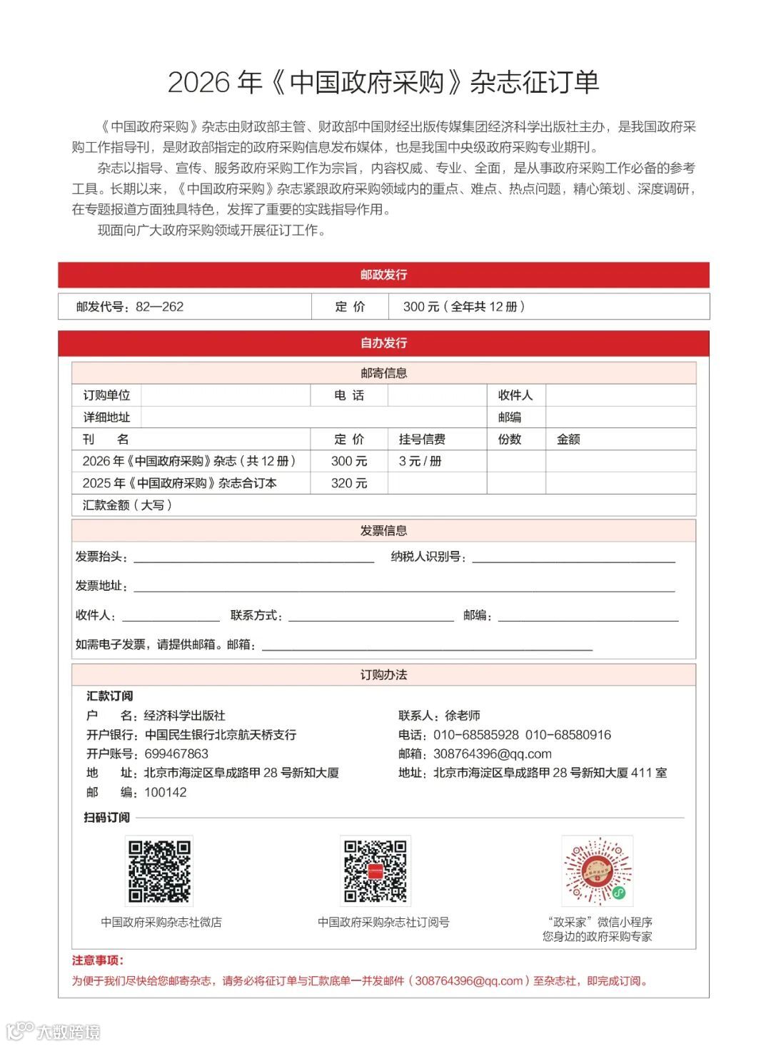 注意事项:汇款时请备注手机号,并将征订单与汇款凭证一并发送至邮箱,以便及时处理订阅事宜。