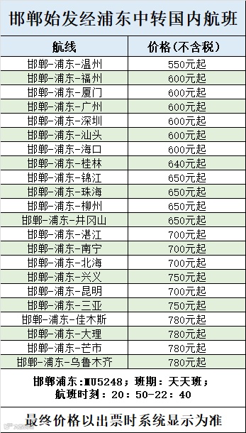 旅客从邯郸机场出发,可选择任意航空公司航班经上述枢纽中转,通达全国多个城市,享受便捷高效的出行服务。