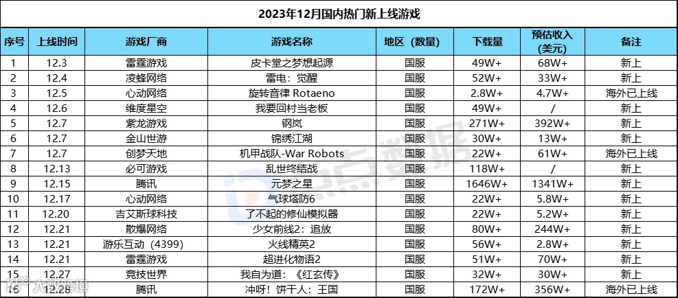 而综合来看12月国内全部热门新上线游戏的整体数据,12月国内市场也是在《元梦之星》的带领下继续回暖,16款产品总流水突破了2600万美元。其中除了《元梦之星》贡献了过半流水外,紫龙游戏推出的硬核机甲战棋游戏《钢岚》以及腾讯与畅游联合代理发行的卡牌手游《冲呀!饼干人:王国》同样取得了不俗的收入成绩。